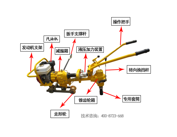 內(nèi)燃液壓螺栓扳手分為單頭的螺栓扳手及雙頭的螺栓扳手,今天為您介紹一款液壓單頭螺栓扳手型號為NLB-700,這款機(jī)器適用于鐵路、地鐵及輕軌線路的混凝土軌枕扣件螺母的松緊作業(yè)。本機(jī)采用汽油機(jī)作動力,輸出軸為單頭、單速,正反轉(zhuǎn)可調(diào),輸出扭矩可徒手調(diào)節(jié)并明確顯示,整機(jī)操作簡便,平安可靠,上下道方便。