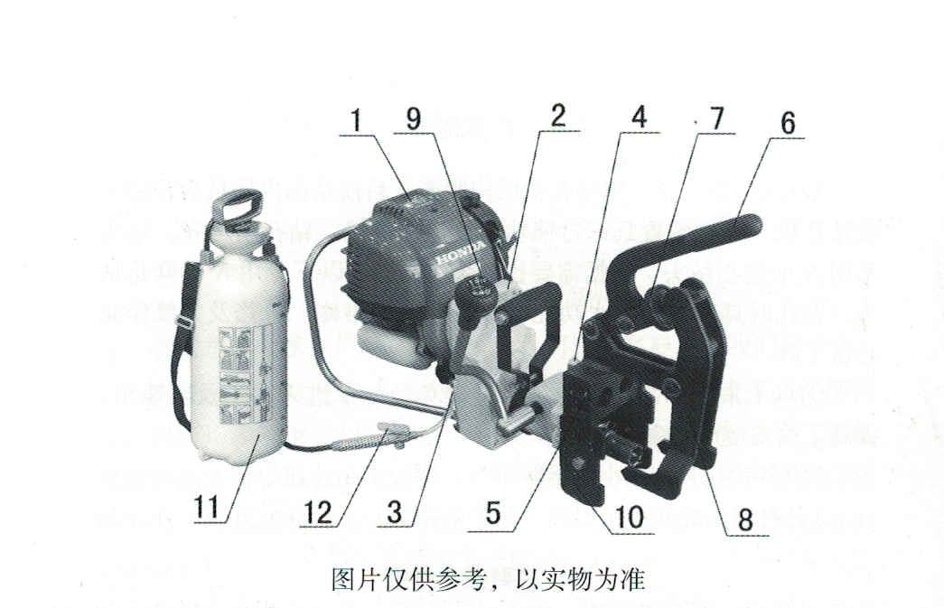 1. 汽油機(jī)、2.齒輪箱、3.進(jìn)水嘴、4標(biāo)尺定位器、5.定位尺、6.夾緊搖臂、7.調(diào)整螺母、8.夾具體、9.進(jìn)給扳把、10.定位塊、11.注水桶、12.水閥